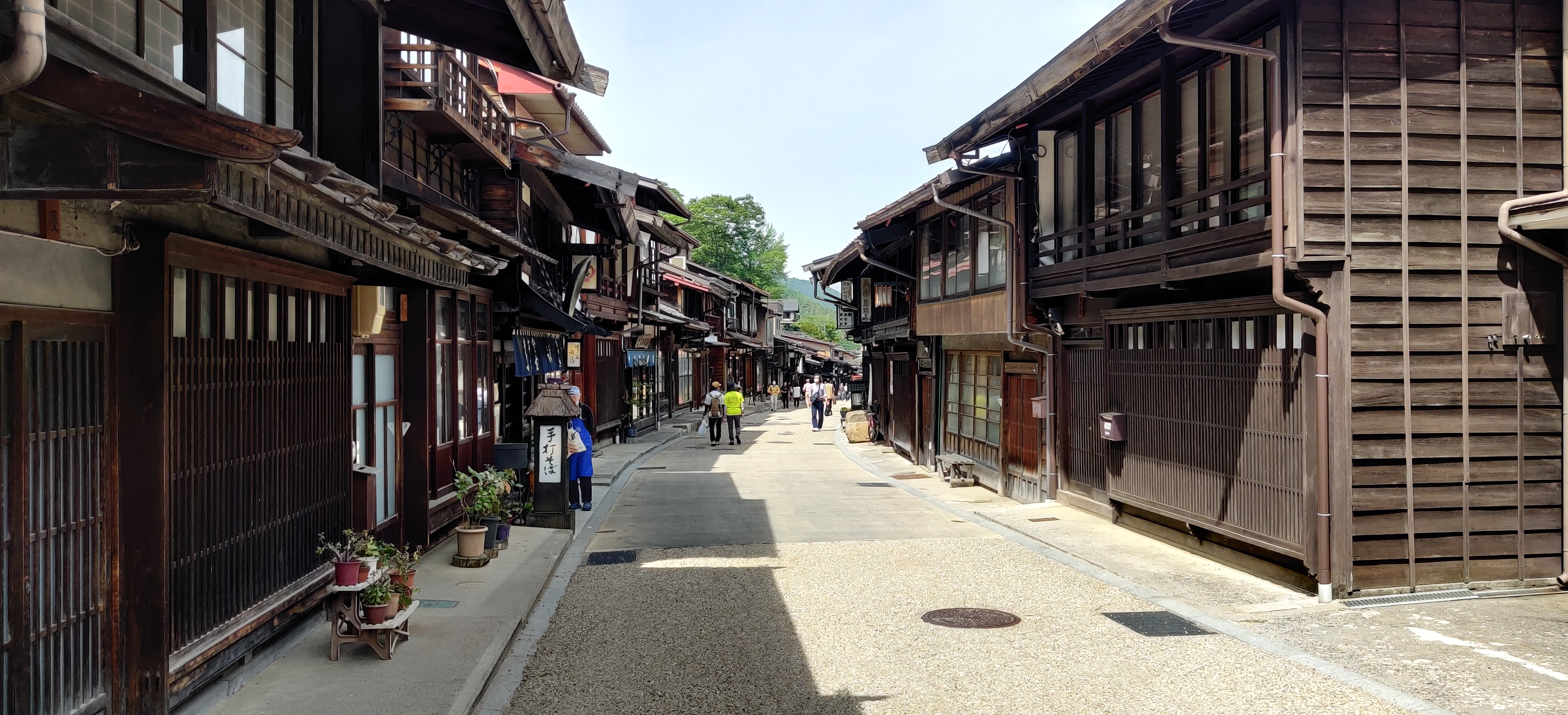 Japanilaistyylisen aamiaisen jälkeen sanoimme heipat isännälle, kiitimme majoituksesta sekä erinomaisista aterioista ja riensimme junaan. Kohteena oli Nagoya pääasissa yöpymistä varten, mutta päivän kohteena oli matkan varrella oleva Narain kylä. Se oli ollut ennen modernisaatiota osa postireittejä Kioton ja Tokion alueen välillä. Kylän pääkatu oli kilometrin mittainen pätkä Edo-kauden ajan mukaan tehtyjä rakennuksia, täynnä kauppoja ja ravintoloita turisteille. Oli ihan hienon näköistä ja tunnelmallista.