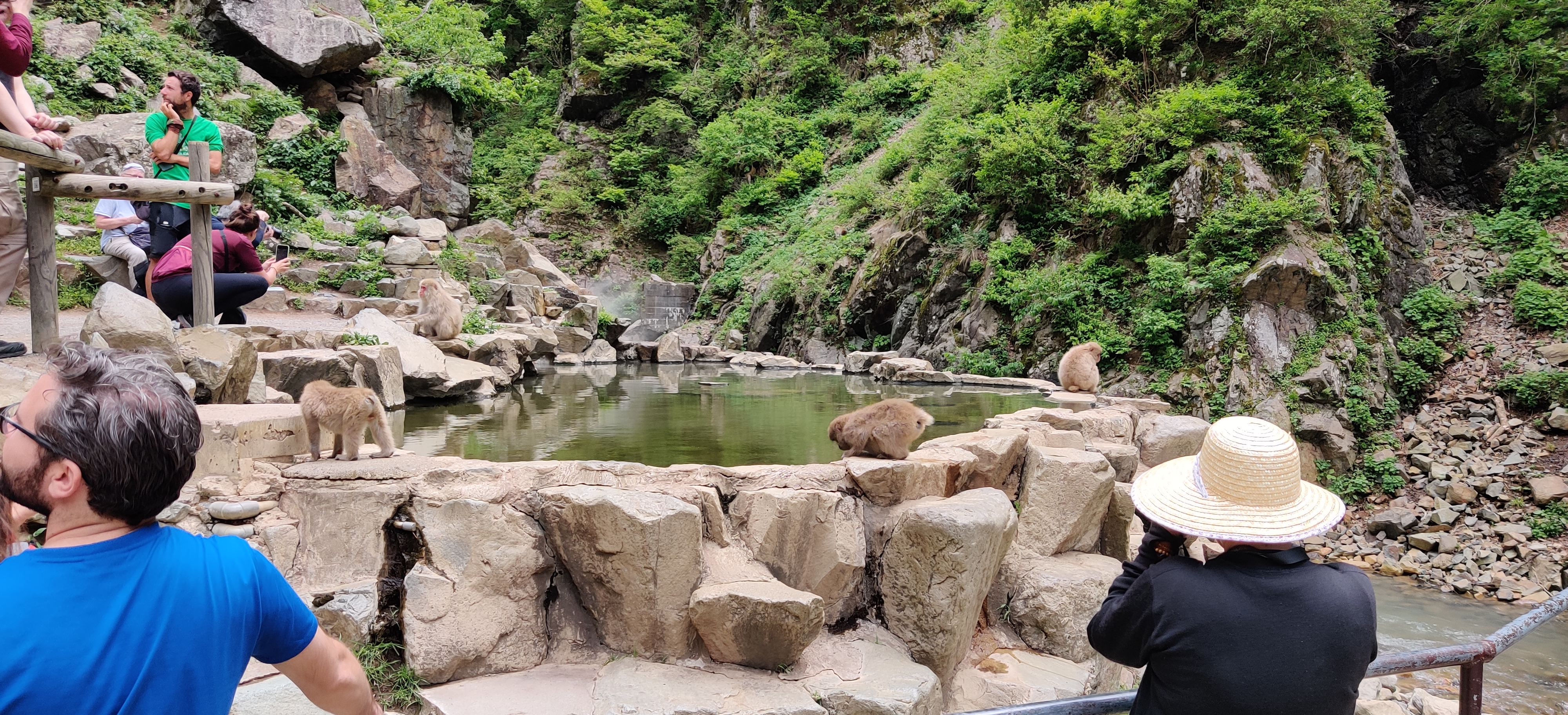 Ei ei tarvinnut odottaa kauan, että ensimmäiset japaninmakakit ilmestyivät näkösälle. Lähellä varsinaista puistoaluetta oli hyvin vanha ryokan, jossa oli kyllästytty paikalla pyöriviin apinoihin, joten hieman ylemmäs jokea perustettiin niille oma kylpylä. Makakit eivät paljon ihmisiä pelänneet, vaan viilettivät menemään tai jäivät puhdistamaan toisiaan samoille poluille mitkä oli vierailijoillekin tarkoitettu. Niitä ei tietenkään saanut syöttää ja puiston säännöissä kehoitettiin pitämään vähän turvaväliä, mutta aika lähietäisyydeltä pääsi kuvaamaan.