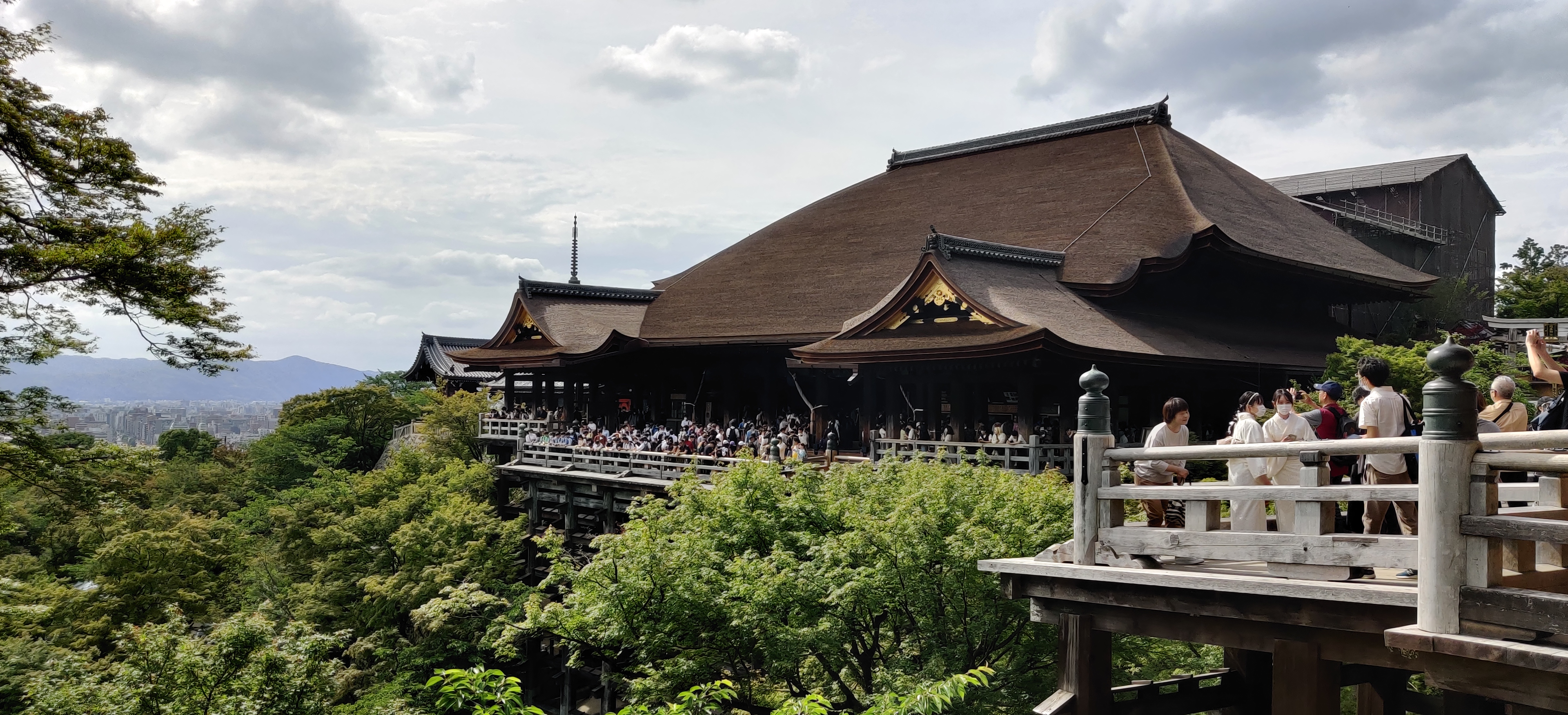 Kiyomizudera oli valtavan täynnä ihmisiä, mutta etenemään pääsi silti. Temppeli oli rakennettu vuoren rinteelle vaikuttavalle alueelle niin, että sen ulkopuolelta oli näkymä alas kaupunkialueelle. Temppeli oli muutenkin melko massiivinen. Temppelialuetta eteen päin kulkiessa ja varsinaisen temppelialueen jäädessä taakse tuli vastaan useita kaupustelijoita. Ostin eräästä kojusta paikallista sencha-teetä.